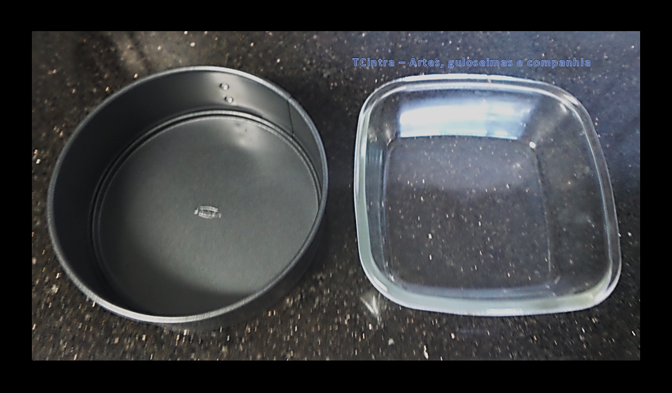 - Separe a forma que irá usar. Eu escolhi uma forma desmontável com 25 cm de diâmetro. Dica: Não precisa untar e nem polvilhar. Se preferir use uma forma refratária de vidro ou louça. Pode-se usar forma de silicone, tendo-se o cuidado de apoiá-la sobre uma assadeira.